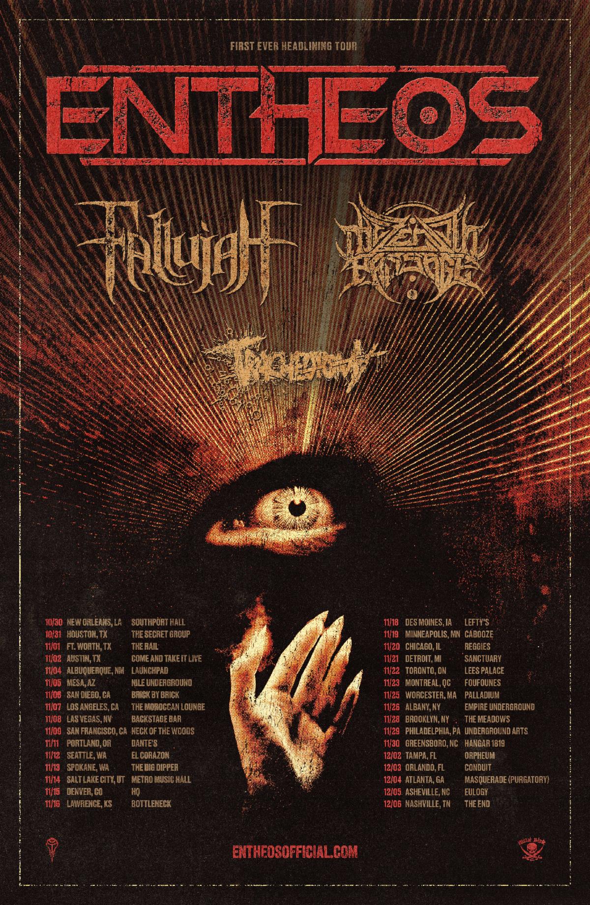 Stream/purchase the track at: metalblade.com/entheos. ENTHEOS’ latest single comes in advance of their first ever North American headlining tour! The month-long trek will commence on October 30th in New Orleans, Louisiana and run through December 6th in Nashville, Tennessee. Support will be provided by Fallujah, The Zenith Passage, and Tracheotomy. Tickets are on sale now at entheosofficial.com. See all confirmed dates below. ENTHEOS w/ Fallujah, The Zenith Passage, Tracheotomy: 10/30/2025 Southport Hall – New Orleans, LA 10/31/2025 The Secret Group – Houston, TX 11/01/2025 RBC Deep Ellum – Dallas, TX 11/02/2025 Come And Take It Live – Austin, TX 11/04/2025 Launchpad – Albuquerque, NM 11/05/2025 Nile Underground – Mesa, AZ 11/06/2025 Brick By Brick – San Diego, CA 11/07/2025 The Moroccan Lounge – Los Angeles, CA 11/08/2025 Backstage Bar – Las Vegas, NV 11/09/2025 Neck Of The Woods – San Francisco, CA 11/11/2025 Dante's – Portland, OR 11/12/2025 El Corazon – Seattle, WA 11/13/2025 The Big Dipper – Spokane, WA 11/14/2025 Metro Music Hall – Salt Lake City, UT 11/15/2025 HQ – Denver, CO 11/16/2025 Bottleneck – Lawrence, KS 11/18/2025 Lefty's – Des Moines, IA 11/19/2025 Cabooze – Minneapolis, MN 11/20/2025 Reggies – Chicago, IL 11/21/2025 Sanctuary – Detroit, MI 11/22/2025 Lees Palace – Toronto, ON 11/23/2025 Foufounes – Montreal, QC 11/25/2025 Palladium (Upstairs) – Worcester, MA 11/26/2025 Empire Underground – Albany, NY 11/28/2025 The Meadows – Brooklyn, NY 11/29/2025 Underground Arts – Philadelphia, PA 11/30/2025 Hangar 1819 – Greensboro, NC 12/02/2025 Orpheum – Tampa, FL 12/03/2025 Conduit – Orlando, FL 12/04/2025 Masquerade (Purgatory) – Atlanta, GA 12/05/2025 Eulogy – Asheville, NC 12/06/2025 The End – Nashville, TN ENTHEOS Live Lineup: Chaney Crabb – vocals Navene Koperweis – drums Scott Carstairs – guitar Michael Stancel – guitar For ENTHEOS coverage contact liz@earsplitcompound.com. https://www.facebook.com/entheosband https://www.instagram.com/entheosofficial https://www.tiktok.com/@entheosofficial https://entheosofficial.bandcamp.com https://www.facebook.com/metalbladerecords https://www.instagram.com/metalbladerecords https://www.metalblade.com/museum ENTHEOS - “Empty On The Inside” video still by Rachel Craig ![]() ![]() |