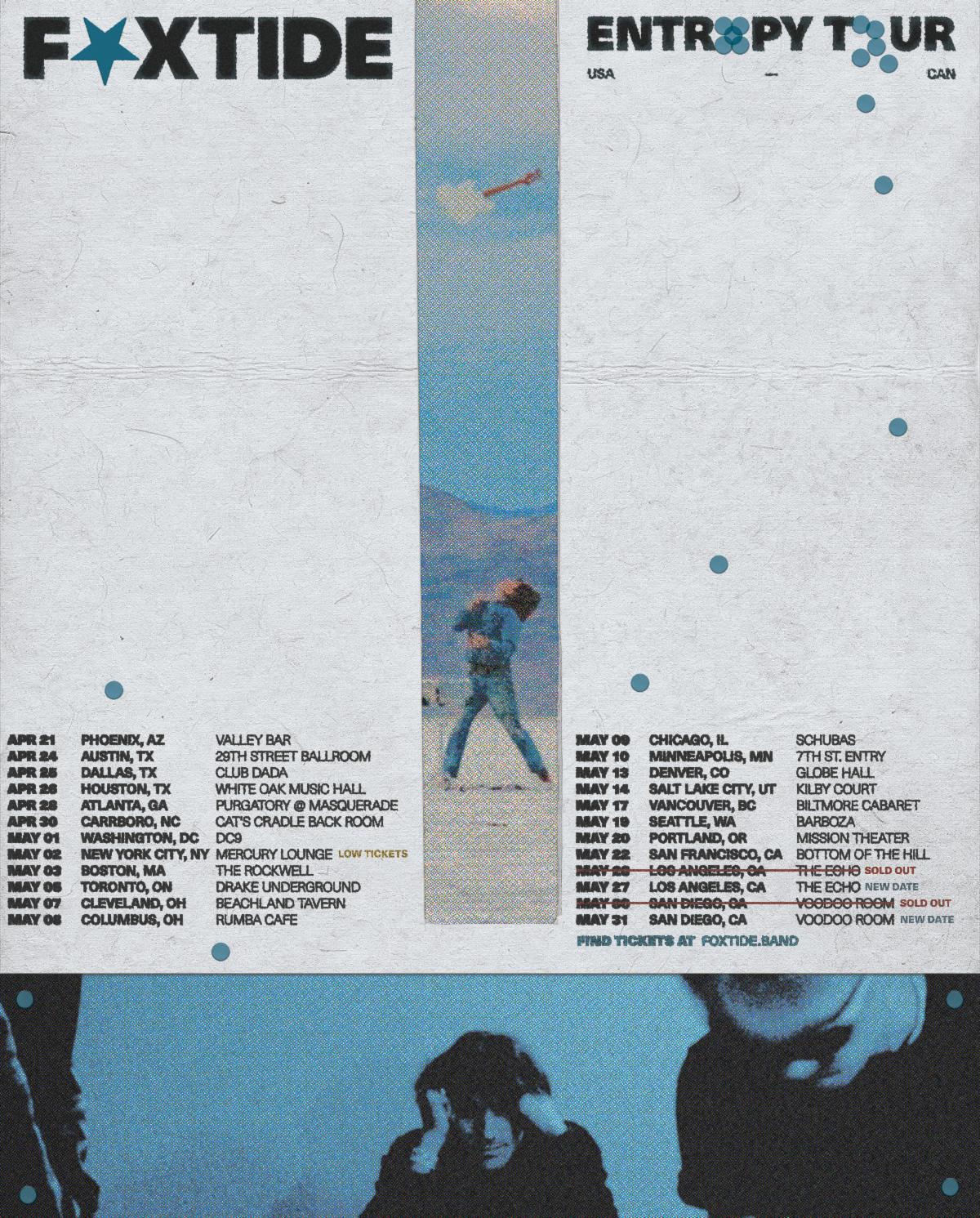 ![]() press photo by Kylen Lunn “... half-Vampire Weekend, half-Strokes; a tribute piece to the golden age of indie rock.” ![]() “Foxtide is what happens when jazz kids grow up at the epicenter of a West Coast house show renaissance.” ![]() Today, San Diego’s Foxtide release one more single ahead of their new record, titled “Wait it Out.” The closing track of the upcoming album, Foxtide show themselves a lot of grace on the new song. Tender, patient, and anthemic, “Wait it Out” leafs through the pages of a chapter without allowing the book to slam shut — Stream. Arriving on April 17 via Position Music, Foxtide will release their second album titled Entropy. A more mature step away from the surf-rock foundation the band introduced themselves with, Entropy draws near to the disorderly quality of life. Where celestial, nostalgic synths soar, the record remains tethered by guitar-forward arrangements and unguarded lyrics — Pre-save. Singer Elijah Gibbins-Croft said, “‘Wait it Out’ can be a message to yourself or the ones you love. That you’re willing to be patient for yourself or for them. Whether it’s waiting until you see them again or waiting with them for the hard times to pass.” Ahead of the album, the band has launched their Make Him Run campaign. If Entropy gets over 10,000 pre-saves, bassist Oey James will run a marathon in a Canadian tuxedo, holding his bass. Pre-save and keep up with his progress here. After playing over 100 live shows last year, Foxtide has no plans of staying off the road. Kicking off next month, they will embark on the Entropy Tour. The Los Angeles and San Diego dates sold out within days and second shows were added in each city, with the band’s Brooklyn selling out this week too. Along the way, they will make a stop to perform at Kilby Block Party in Salt Lake City. See all tour dates here and below. UPCOMING TOUR DATES Tuesday, April 21st - Valley Bar - Phoenix, AZ Friday, April 24th - 29th Street Ballroom - Austin, TX Saturday, April 25th - Dada - Dallas, TX Sunday, April 26th - White Oak Music Hall - Houston, TX Tuesday, April 28th - Purgatory @ Masquerade - Atlanta, GA Thursday, April 30th - Cat's Cradle Back Room - Carrboro, NC Friday, May 1st - DC9 - Washington, DC Saturday, May 2nd - Mercury Lounge - Brooklyn, NY (SOLD OUT) Sunday, May 3rd - The Rockwell - Boston, MA Tuesday, May 5th - Drake Underground - Toronto, ON Thursday, May 7th - Beachland Tavern - Cleveland, OH Friday, May 8th - Rumba Cafe - Columbus, OH Saturday, May 9th - Schubas - Chicago, IL Sunday, May 10th - 7th St Entry - Minneapolis, MN Wednesday, May 13th - Globe Hall - Denver, CO Friday, May 14th - Kilby Block Party - Salt Lake City, UT Monday, May 17th - Biltmore Cabaret - Vancouver, BC Tuesday, May 19th - Barboza - Seattle, WA Wednesday, May 20th - Mission Theater - Portland, OR Friday, May 22nd - Bottom of the Hill - San Francisco, CA Saturday, May 23rd - The Echo - Los Angeles, CA (SOLD OUT) Wednesday, May 27th - The Echo - Los Angeles, CA Sunday, May 30th - Voodoo Room - San Diego, CA (SOLD OUT) Sunday, May 31st - Voodoo Room - San Diego, CA All tour info here .ENTROPY TRACK LIST “Entropy” “Days Move Slow” “Cut and Dry” — watch “Can’t Get Enough of It” “Live by the Sun” — watch “Heart in the Ground” “Start of Nothing” “Wait Until It Happens” “What Good is the Rain” “Hand to Hand” “Wait it Out” ABOUT FOXTIDE: Made up by Elijah Gibbins-Croft, Oey James and Ian Robles, Foxtide is a byproduct of being bred by the beach and raised by a DIY house show scene. The SoCal three-piece was formed around garage jam sessions and earned their cult following through the intense vitality of their live shows. First starting to release music in 2019, it was the band’s second EP Visions in 2021 that took them from a hometown secret to a band to watch nationally. Foxtide has previously played alongside The Backseat Lovers, Echo & The Bunnymen, Lime Cordiale, Sarah and the Sundays, Mustard Service, Beach Goons, and joined the lineup of Shabang, Nothing Fest, and more. Moving into the chapter of their next project, Foxtide is abandoning the idea that they need to create “perfect” music, and simply making what they like to listen to. Tinged with the aloofness of early 2000s rock, while experimenting with the formulas of modern pop, all threads are knotted in the authenticity behind Foxtide’s unrelenting love for music. The band's third EP Paradise helped them secure critical looks from Fashionably Early 'Bands that Deserve to be Bigger', Luna Collective Magazine, and their debut LA headline show selling out. Their most recent record earned them the cover of Fashionably Early's playlist as well as their first editorial look from Spotify in 'All New Rock,' and Apple's 'New In Rock' and 'New In Alternative.' On the heels of the deluxe version, the band secured support tours with Arcy Drive, Pity Party Girls Club, and more to be announced. Foxtide has most recently signed a record deal with Position Music, and will be releasing their second full length LP, Entropy on April 17th. ### For more information on Foxtide, please visit: Website | Instagram | YouTube | Spotify | Apple Music |