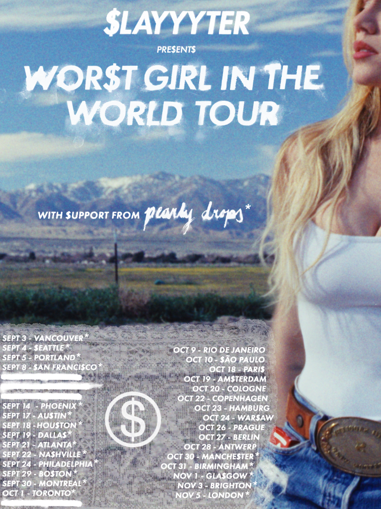 SLAYYYTER ANNOUNCES WOR$T GIRL IN THE WORLD TOUR WITH STOPS IN NORTH AMERICA, SOUTH AMERICA, THE UK AND EUROPE GENERAL ONSALE BEGINS FRIDAY, MARCH 20TH HERE UPCOMING ALBUM WOR$T GIRL IN AMERICA OUT MARCH 27